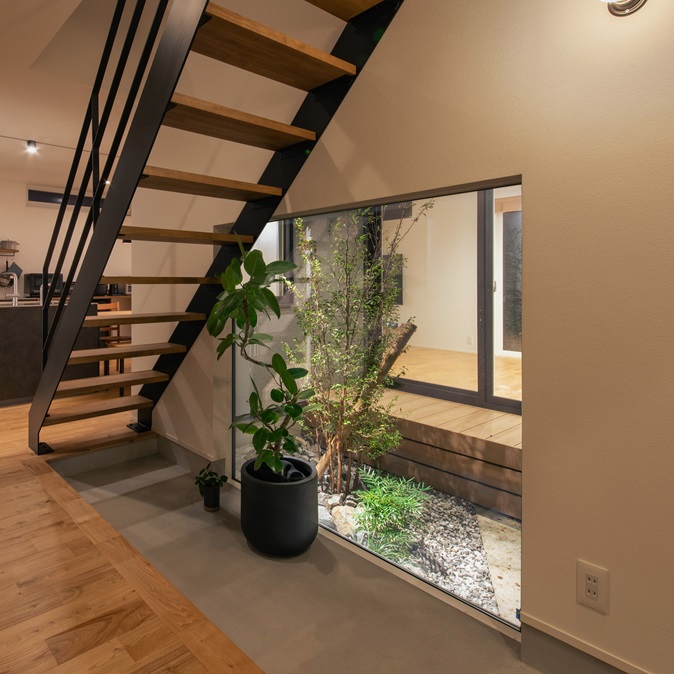 こうすることで月明りの様に植栽や地面が照らされ、夜でも部屋の中からお庭を楽しむことが出来ます。