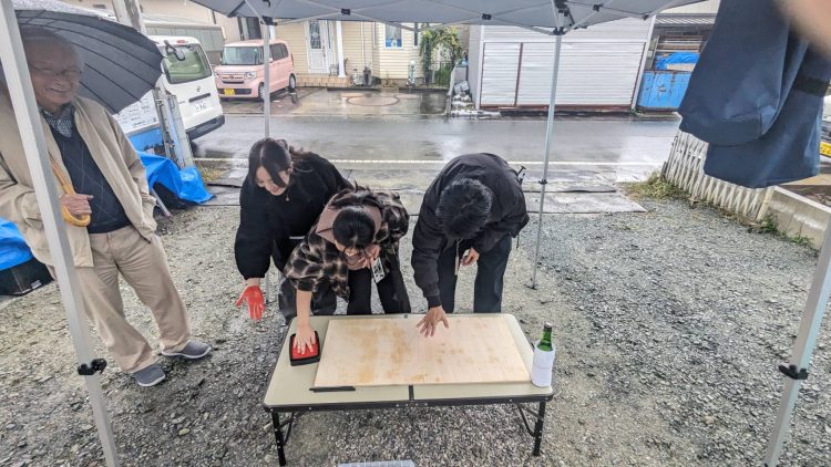 上棟後は、N様ご家族と一緒に手形式を行い、これからの工事の安全とご家族の繁栄を祈願しました。