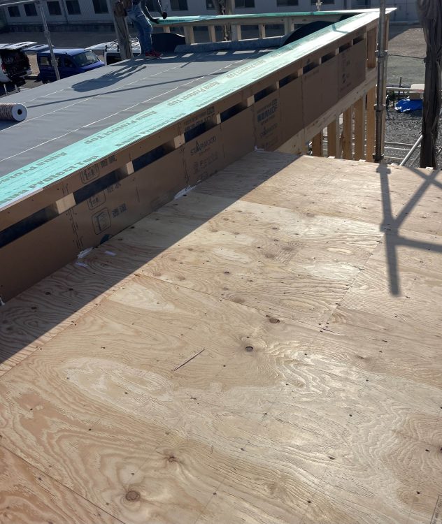 先日上棟した物件、屋根水上にパラペットが立ち上がるプランでした。