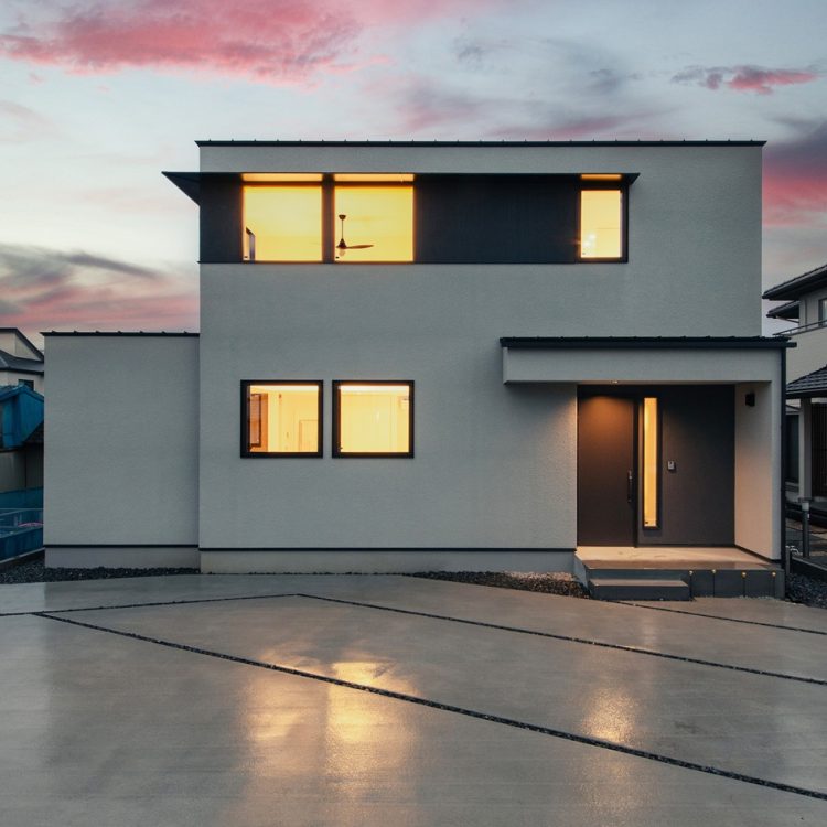「植栽がないと殺風景にならない?」と思われるかもしれませんが、ご安心ください。コンクリートの「目地(ライン)」を建物と一体的に計画することで、建物そのものの美しさを引き立てる洗練された外観をつくることができます。浜松の空に映える、凛とした住まいが完成します。