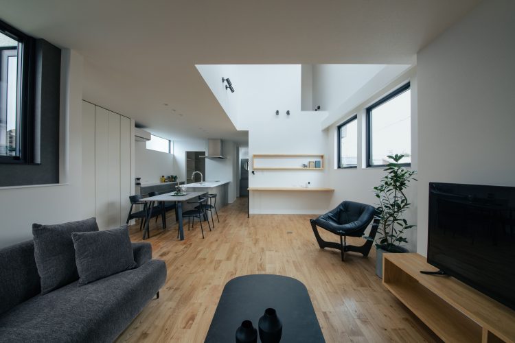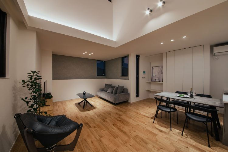 LDKの中央には、自動麻雀卓用のフロアコンセントを設置。友人が集まれば麻雀、ダイニングではボードゲーム、ソファではゲームと、一つの空間でそれぞれが自由に過ごせます。