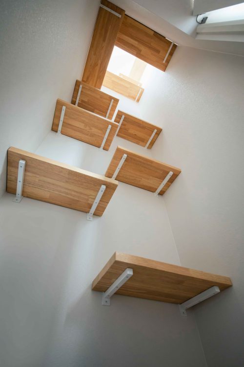 猫のアレルギーを持つお子様への配慮と、猫を部屋に閉じ込めたくないという想いを両立。廊下に出さずとも上下運動ができる専用の猫ステップを提案しました。これは既製品を並べるだけの設計では生まれない、建築家ならではの遊び心です。