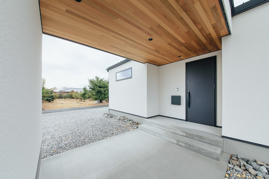 玄関の前に設けた車寄せが印象的なF様邸。共働きで忙しくされているご夫婦は、寛げる家づくりを大切にされ、プライバシーを確保し、家事負担を減らすことで日常を豊にする家づくりがスタート。