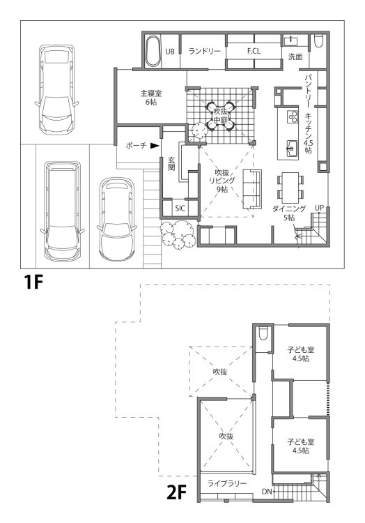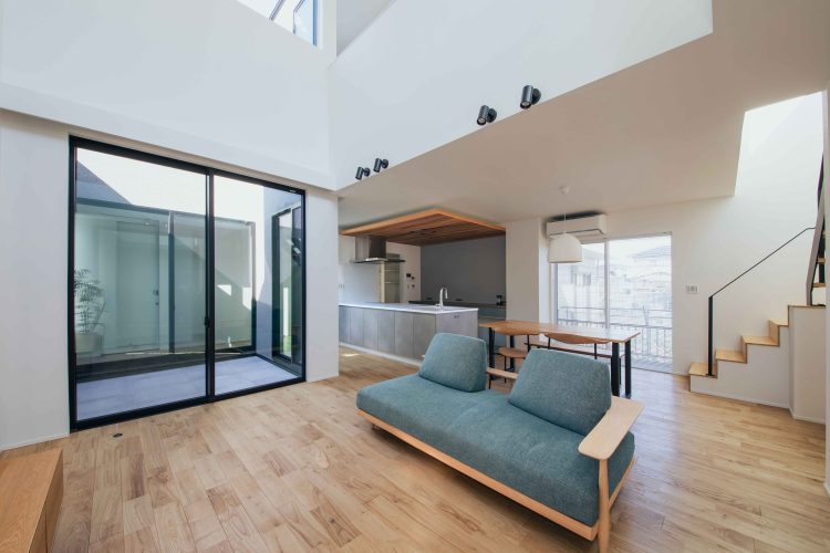 駐車場3台の確保、中庭、そして1階の寝室。一見すると面積的に厳しい条件を、建築家は中庭を介してプライバシーを確保する手法でクリアしました。道路側の音や視線を遮りつつ、光を取り込む中庭。その奥に配置された寝室は、1階にありながら静寂に包まれ、夜中の育児も移動の負担なくスムーズに行える安心の空間です。
