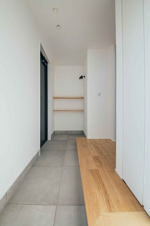 当初は流行のシューズクローク(通り抜け型)を検討されていましたが、自身の性格を分析し、あえて壁面の大型収納を選択。通り抜けスペースをなくして収納量を最大化し、扉を閉めれば常にスッキリ見える、機能性を重視したオーダーメイドの答えです。