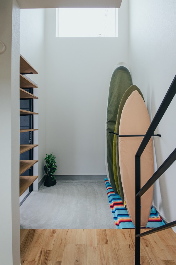 玄関を吹き抜けにすることで、天井高もしっかりと確保でき、約3mのロングボードもラクラク置けるようになっています。