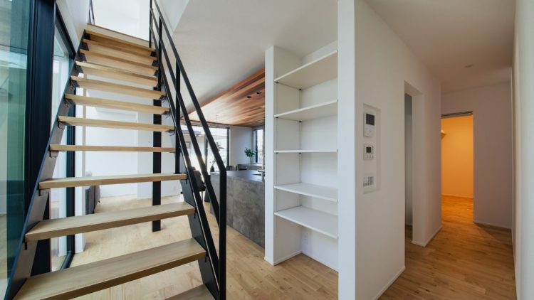 中庭の北側に鉄骨階段を置くことで、エントランスやキッチンまで光を届け、家全体を明るくしています。
