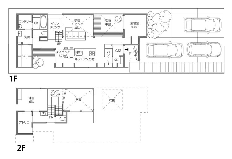 将来のために車3台分を確保したい。しかし、間口7.8mの細長い敷地でそれを叶えると、屋内通路が長くなり居住スペースが削られてしまうという課題がありました。