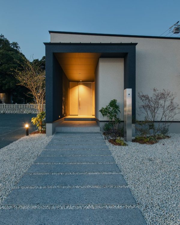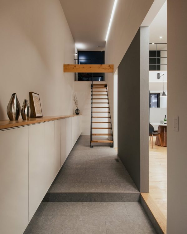目の前は車通りの多い道路。しかし、一歩敷地に足を踏み入れると空気は一変します。 あえて南側に窓を設けず、長いトンネルのような、参道に見立てたアプローチを抜けることで、外の世界と切り離された静寂が訪れる。 ただ住むだけではない、心を整えるための邸宅です。