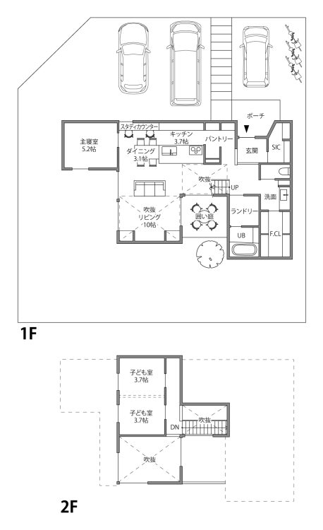敷地が広く、南西方向に視線が抜ける立地を活かすため建物をF型に配置。道路からの視線をカットしながら美しい景色を楽しめる「眺望庭」と、よりプライバシー性を高めたコンパクトな「囲い庭」の2つを計画しました。BBQを楽しんだり、ご夫婦でお酒を飲んだりと目的に合わせて居場所を使い分けられる贅沢な屋外空間です。