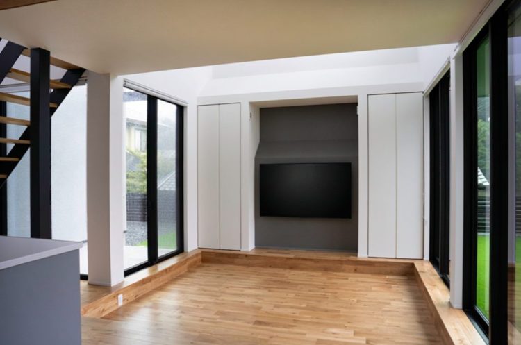 「実家のようにゴロゴロくつろぎたい」というご要望への答えが床を一段下げたダウンリビング。動線の邪魔にならない行き止まりに配置し、低い目線で外の庭を眺められる特別な空間です。テレビ周りは壁掛けにして配線を横の収納へ隠蔽。さらに上部のエアコンも幕板で隠し、斜めの壁に間接照明を設けることで吹き抜け部分を美しく明るく照らす造作感のあるしつらえにしています。