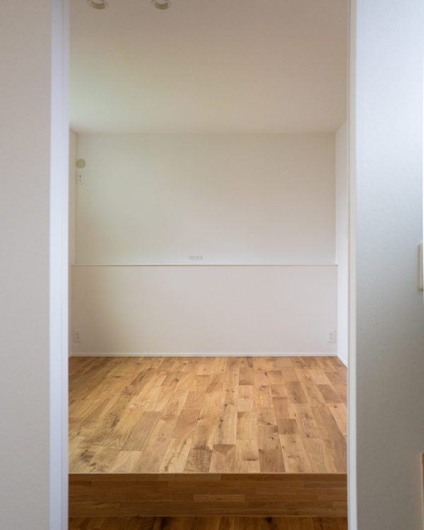 階段を上がった先の吹抜から視線がスッと抜け、南と西に設けた大きな窓から遠くの景色をパノラマで眺めることができます。また、将来、階段の上り下りが億劫になった時のためにと主寝室を1階に配置。マットレスを置いて寝るため、部屋の奥に小上がりを設け、ヘッドボード代わりの低い腰壁を造作しました。